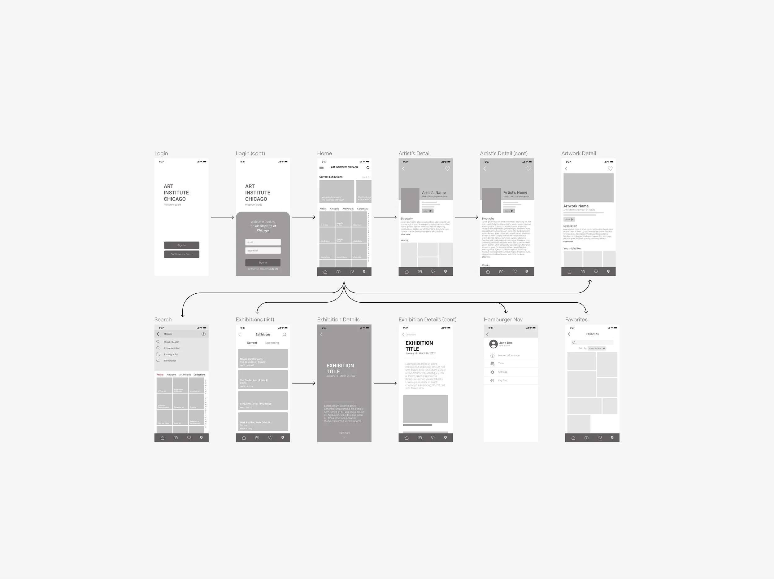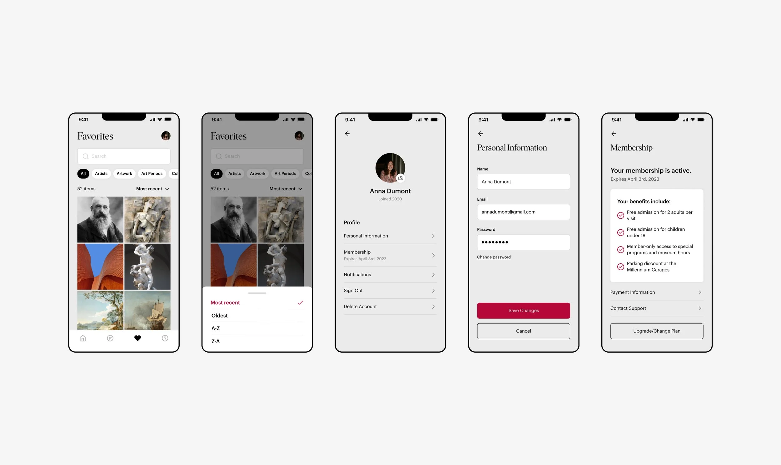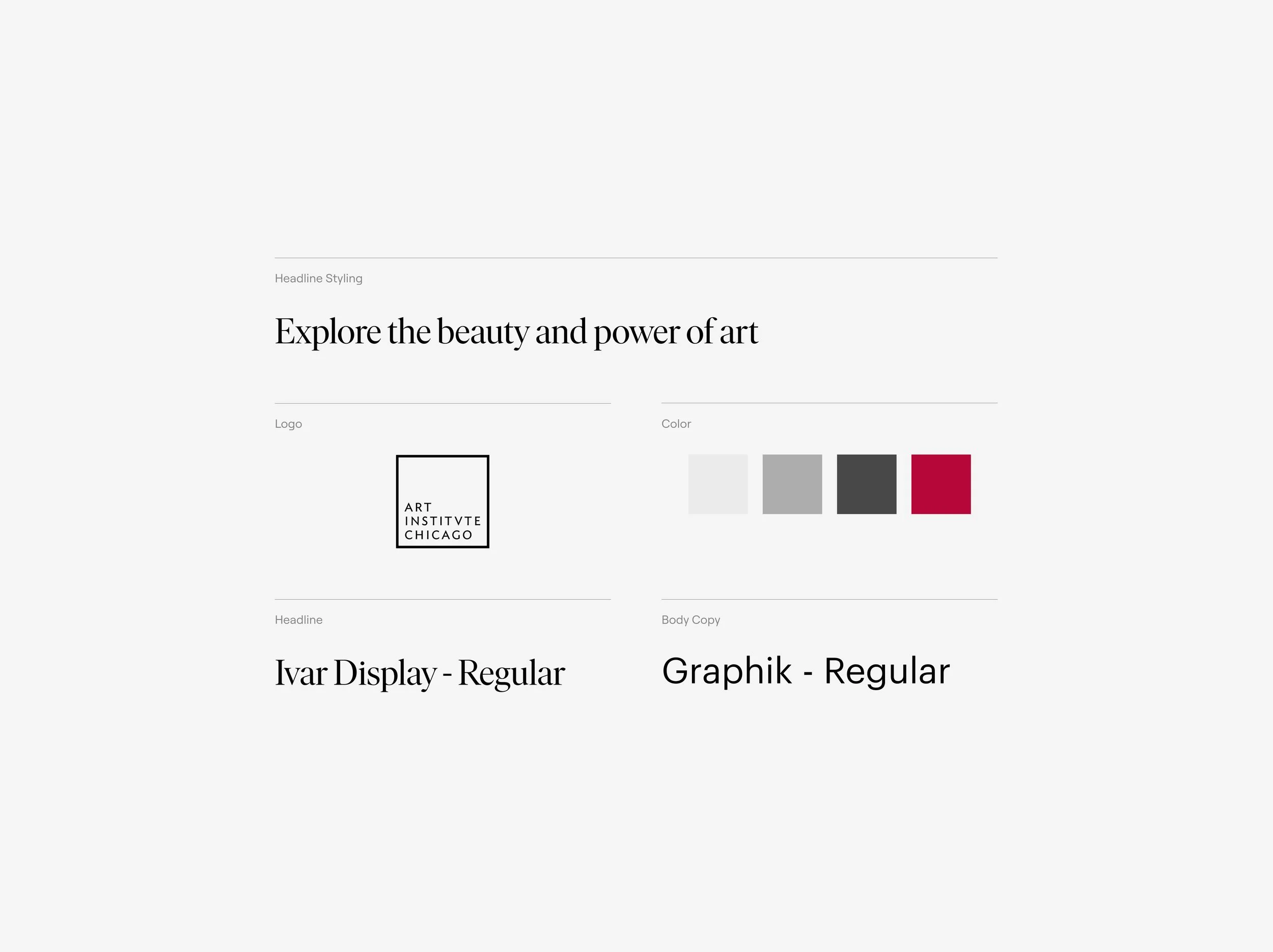 I wanted the visual design to feel refined, fresh, and approachable. Since the Art Institute of Chicago is already such an established institution I wanted the app to feel like an extension of the museum’s existing brand. They currently employ various shades of gray with ample amounts of white space and the occasional pop of berry red. I brought the same colors into the app for brand continuity.